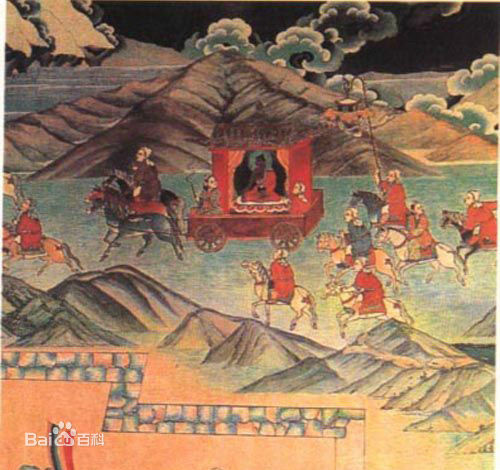 貞觀15年(641)正月十五,唐太宗將文成公主下嫁松贊干布,詔令江夏王李道宗持節(jié)護(hù)送。文成公主在唐送親使江夏王太宗族弟李道宗和吐蕃迎親專使祿東贊的伴隨下,前往吐蕃。文成公主一行從長安出發(fā),途經(jīng)西寧,翻日月山,長途跋涉到達(dá)拉薩。 松贊干布率群臣到河源附近的柏海(今青?,敹嗫h境內(nèi))迎接文成公主,謁見李道宗,行子婿之禮。之后與公主同返邏些(今拉薩),為公主筑城、修建宮室。